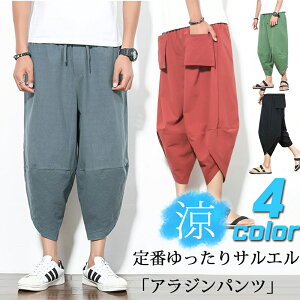 メンズ サルエルパンツ 大きいサイズ 七分丈 サルエル パンツ アラジンパンツ ワイドパンツ ハーフパンツ ゆったり サムエルパンツ メンズ レディース ユニセックス 綿麻 リネンパンツ エスニック 袴パンツ ポケット ルームウェア リラックス ゆったり 部屋着 普段着の